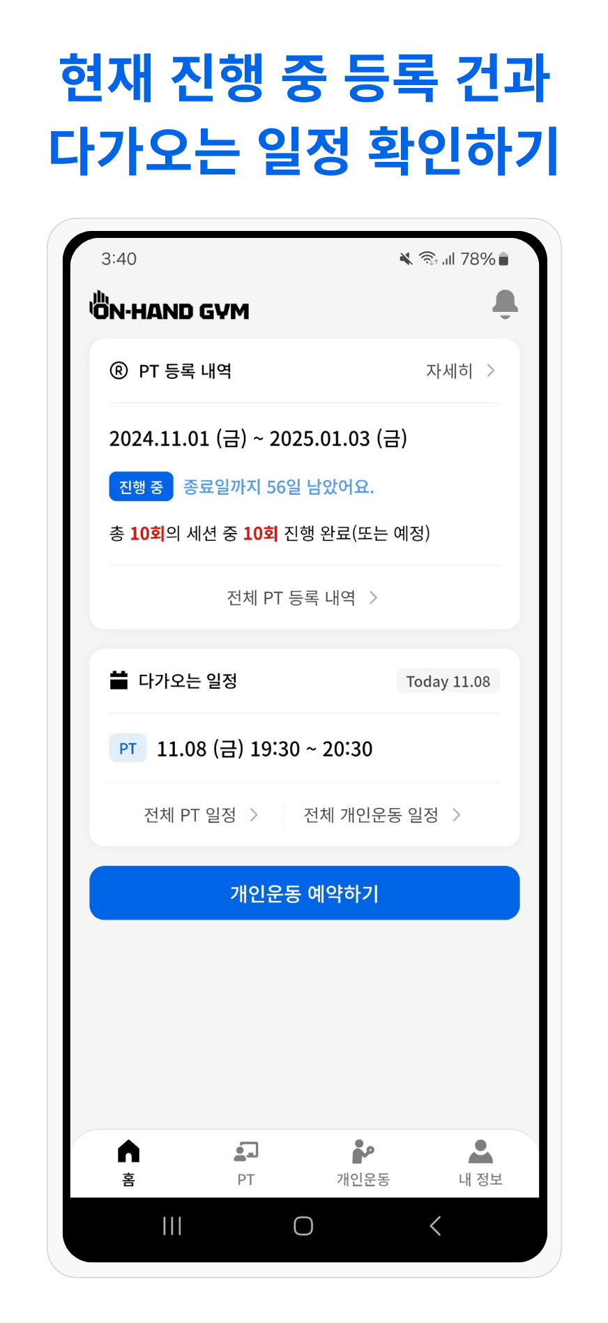 온핸드짐은 치열한 현대 사회에서 잃어버린 운동 에너지를 되살리고 더욱 건강하고 행복한 삶을 지지하는 1:1 PT 전문 스튜디오입니다.